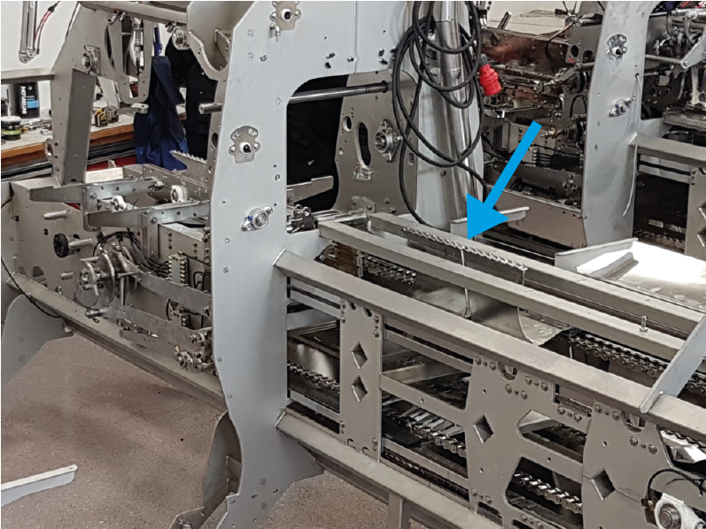 Öflug stálkeðja með tenntum söðlum er notuð til að flytja fiskinn í gegn um vélina sem sker holdið frá beindálkinum